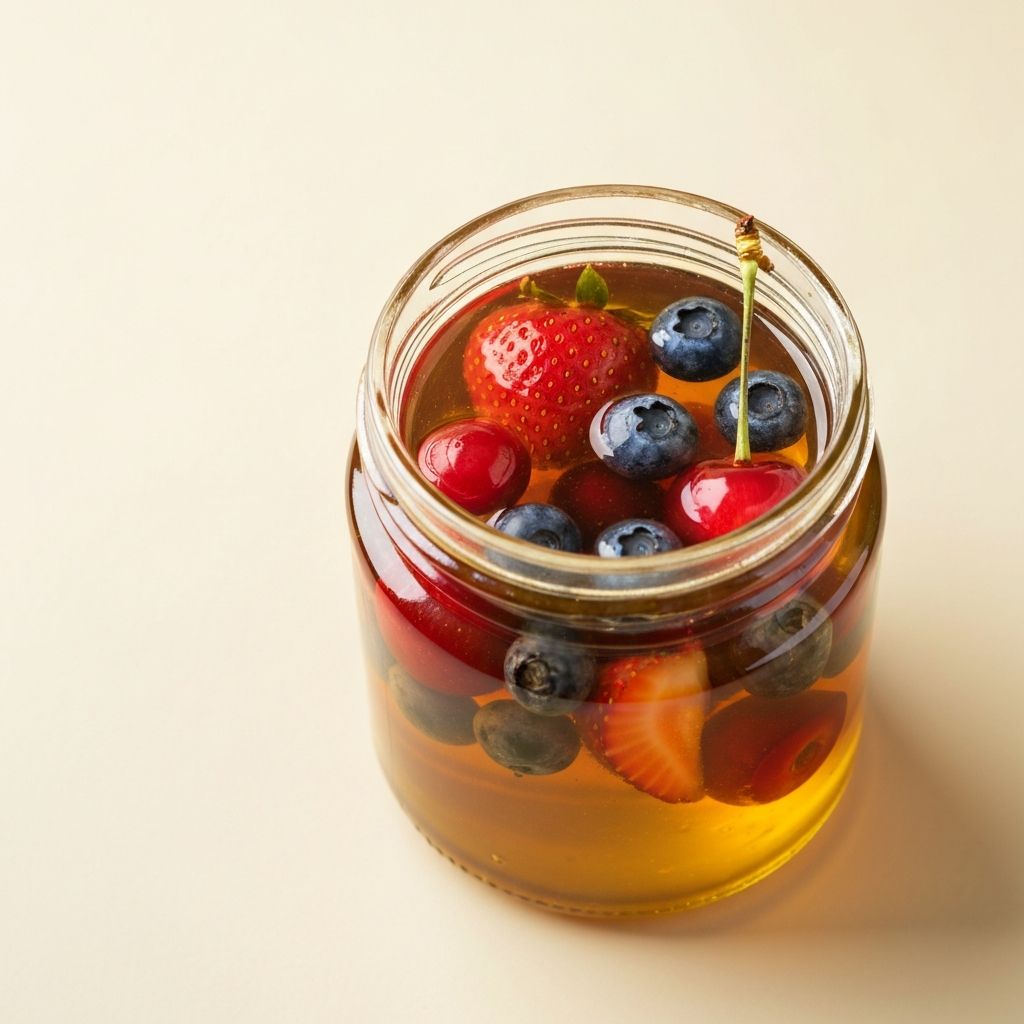 Miel infusionada con moras, fresas, cerezas, arándanos rojos y azules, romero, tomillo y canela. Perfecta para yogures, panqueques, postres y granolas.